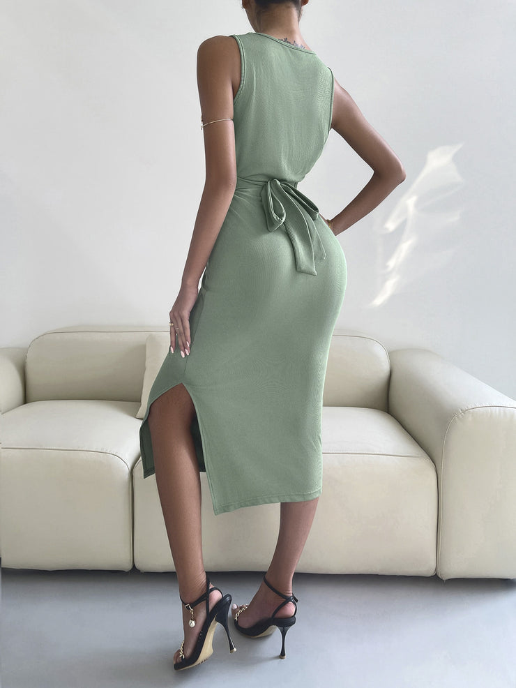BEAUTIFUL I AM Round Neck Tie Back Slit Sleeveless Dress